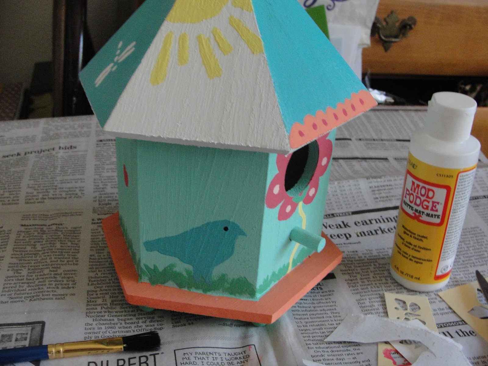 This was my first time painting a birdhouse and the whole process from this 1st pic to modpodgey-ing it took me about 3.5 hours (including letting one layer of paint dry.)